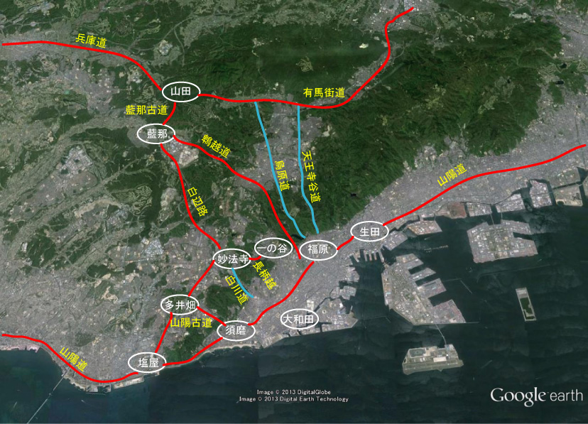 まず軍監である土肥実平が塩屋にいたのは平家物語から確実と考えます。遡れば藍那で行綱と合流した時にも実平は同じだったはずです。そうでないと軍監の役割を果たせません。実平が塩屋に居たのなら義経もまた塩屋にいたと考えるのが妥当です。さらに言えば六甲山系の西側地帯の交通路は源氏が自由に利用できていたとも言えます。