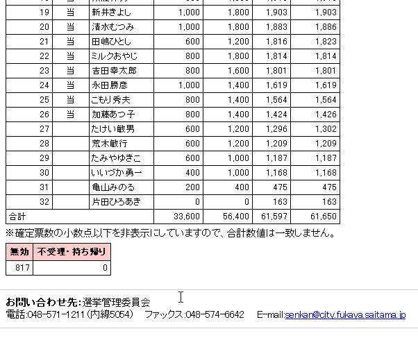 ほいじゃ、この893票の落選候補はどうすれば良かったかですが、参考になる選挙結果があります。深谷市議選では目黒区議選を上回る「色物候補」が出馬し見事当選されています。私もこの情報を聞いて信じられなかったのですが、当選者名がなんと、なんとですが、
