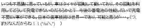 これは実は訂正版で15:34に魚拓で取得したものです。興味深い記事だったので複数の魚拓を取られているのですが、一番古いもので11:50付でオリジナルは14:05付まで存在していたのが確認されます。記事の大部分は真っ当そうな記事で、イスラエルの企業がバッテリー交換式の電気自動車システムを導入しようとしたものの、インフラ整備でギブアップし倒産したとの内容です。内容的には別にどうこう言う記事ではありません。オリジナルで注目を浴びたのは、いつも不思議に思っているが、車はタイヤが回転して動いており、その回転を利用してどうして発電できないのだろうかと? 今後の蓄電池の性能しだいで充電不要EV車ができる。日本の歯車技術は世界一であり、可能と思うが・・・。